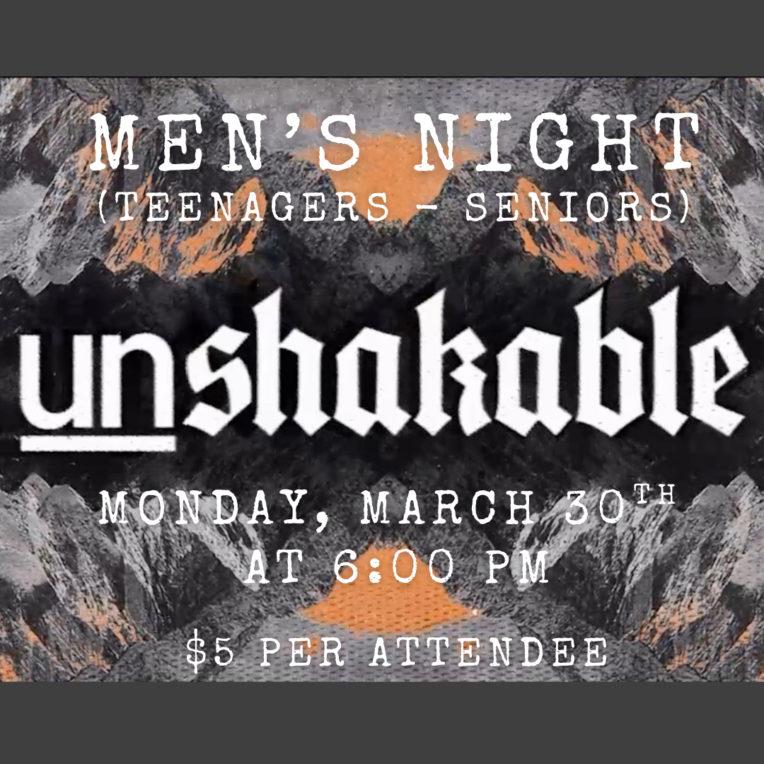 Join us for Men’s Night at NCBC! Monday, March 30 – 6:00 PM – In the Annex (Dinner $5) Teenagers through seniors—come be encouraged and built up together as we dive into our study: UNSHAKABLE Come as you are and be strengthened in faith and brotherhood!